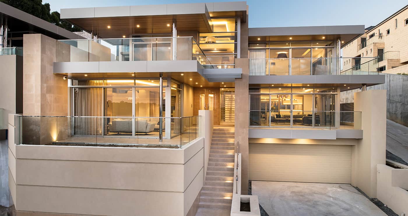 The lot was positioned on a very steep slope which allowed JAV Custom Homes to build the contemporary home without obstructing the neighbouring views. A 185 sqm undercroft forms the foundation of the home, including a four-car garage, a large storeroom, a custom-built wine cellar and a lift capable of holding six passengers. Because of the steep slope, JAV Custom Homes built retaining walls and concrete pilings to suit the requirements of the house.